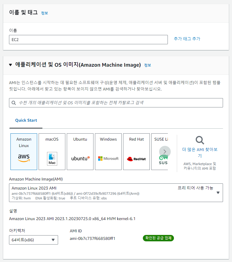 여기서 여러개가 있지만Amazon Linux 2023 AMI와 Amazon Linux 2 2023 AMI 중 Amazon Linux 2023 AMI를 선택한다. 이유는 아직 국내 자료가 리눅스 1이 더 많기 떄문이라고 한다. 보통 센토스 6버전으로 진행되는 자료들은 아마준 리눅스 1 에서 모두 사용할 수 있다고 한다. 반대로, 리눅스 2는 센토스7버전 자료들을 그대로 사용할 수 있다.