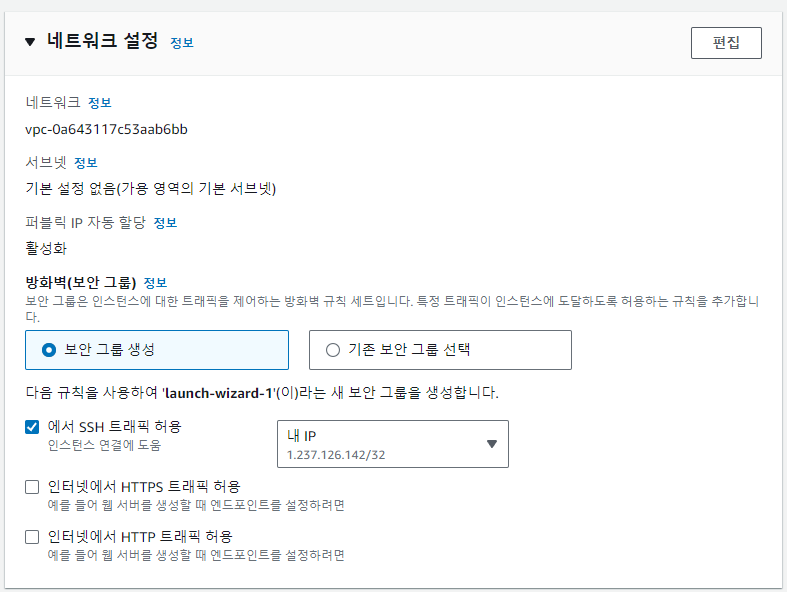일단 SSH 트래픽 허용으로하고 내 IP로 지정해놓도록 하자. 후에 보안 그룹을 생성해서 붙여줄 예정이다.