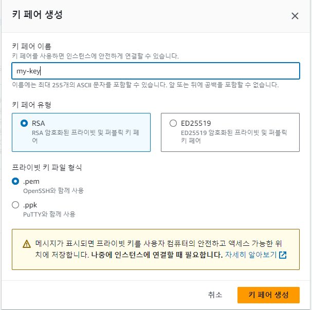 EC2 서버에 SSH 접근을 하기 위해서 키 페어를 생성한다. 정보가 노출이 되면 안되기 때문에 안전한 곳에 저장하고 관리하도록 하자